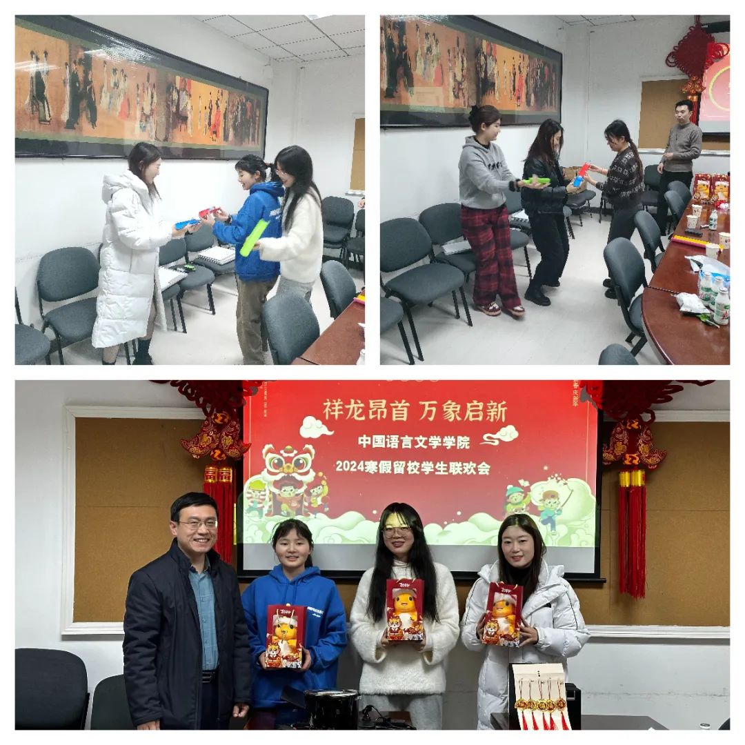 2024年1月18日,为团结好、服务好、凝聚好寒假留校学生,营造温暖祥和的新年氛围,中文学院在传统“腊八”节当日举办留校学生联欢会。中文学院党委书记唐兴全、党委副书记朱向峰、辅导员左尚、郭雪莹参加活动。