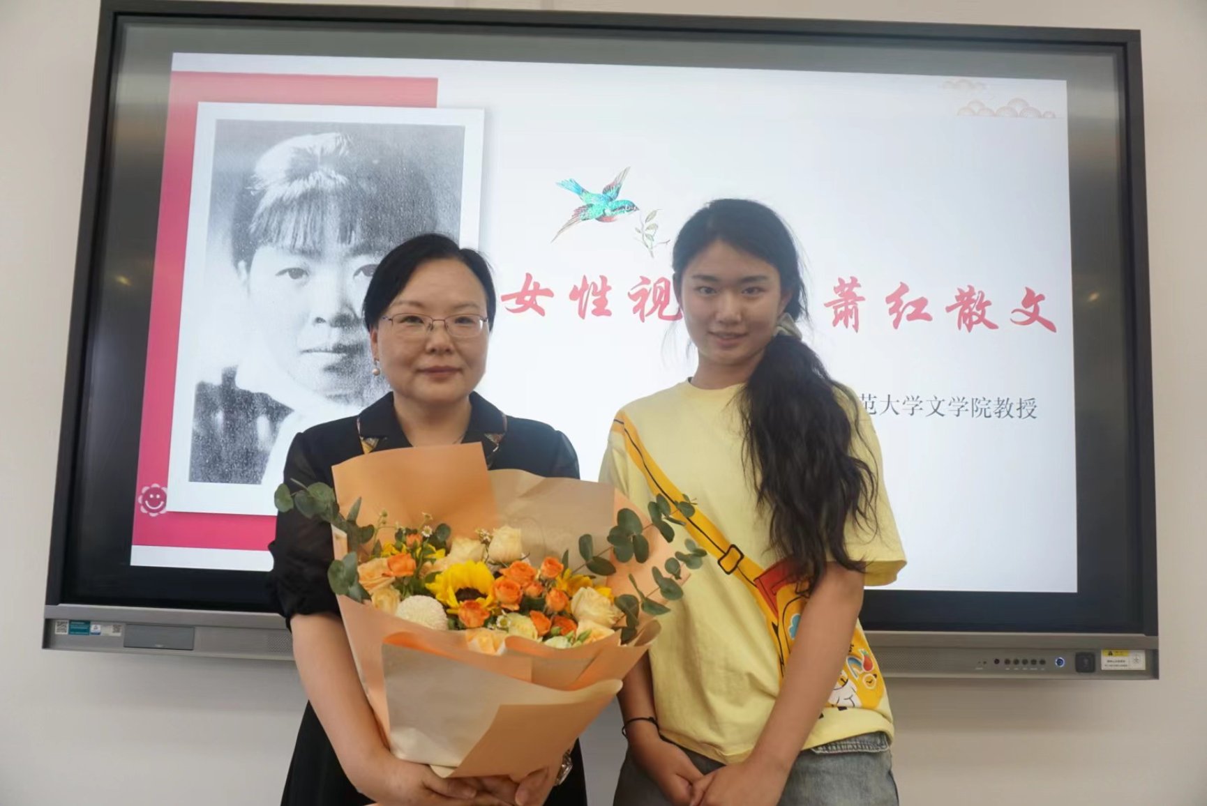 讲座末尾,主持人邓如冰老师对萧红散文和女性文学进行了总结,图书馆周老师和同学们针对讲座内容与张莉老师进行了沟通交流,深入探讨了“什么是女性视角”“怎样拥有女性视角”以及“怎样看待生活中女性视角之外的不和谐声音”等现实话题。最后,体育官网学生代表侯卓君向张莉老师献花,全体师生合影留念,活动圆满结束。