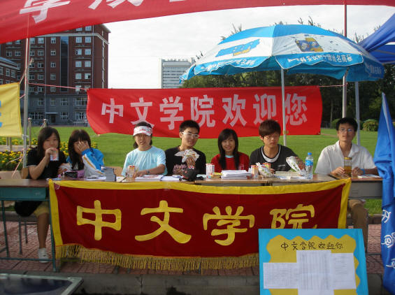 2008年8月31日上午6:30,为了迎接早到的新生,中文学院两位辅导员老师和学生会值班的同学早早地到达了诚信楼前的迎新现场,摆好桌椅,挂好横幅……