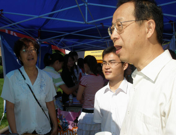 人渐渐多了起来,每次接站的公车一到,几位大三的师兄就扛起中文的院旗和其他院的同学们一起冲向公车,公车前便热闹的像开演唱会一般。他们替新到的同学运送行李,指点流程,等新同学办好手续后,站在桌子后面的同学们就会热情的分发学生证,新生指南等材料,甚至还有他们亲手制作的可爱书签。辅导员李玲玲老师和刘仕博老师则亲切的同新生家长攀谈,解答他们的疑惑。期间,陈准民等校领导莅临中文学院迎新现场,关切的询问招新的情况,并特别了解了一下四川新生的情况。炎炎烈日,老师和志愿者们只顾着迎接新生,甚至顾不上喝一口水,坐下休息一会儿。很快,志愿者换班后,老师和志愿者们依然坚守岗位,等待最后几位新生的到来。下午2点半辅导员老师和团学联干部到新生宿舍慰问新生,关切的询问各方面的需求,为新生答疑解惑。晚上9点,大二全体女生来到新生宿舍看望,与新生进行沟通交流,并积极帮助她们解决生活上的问题。