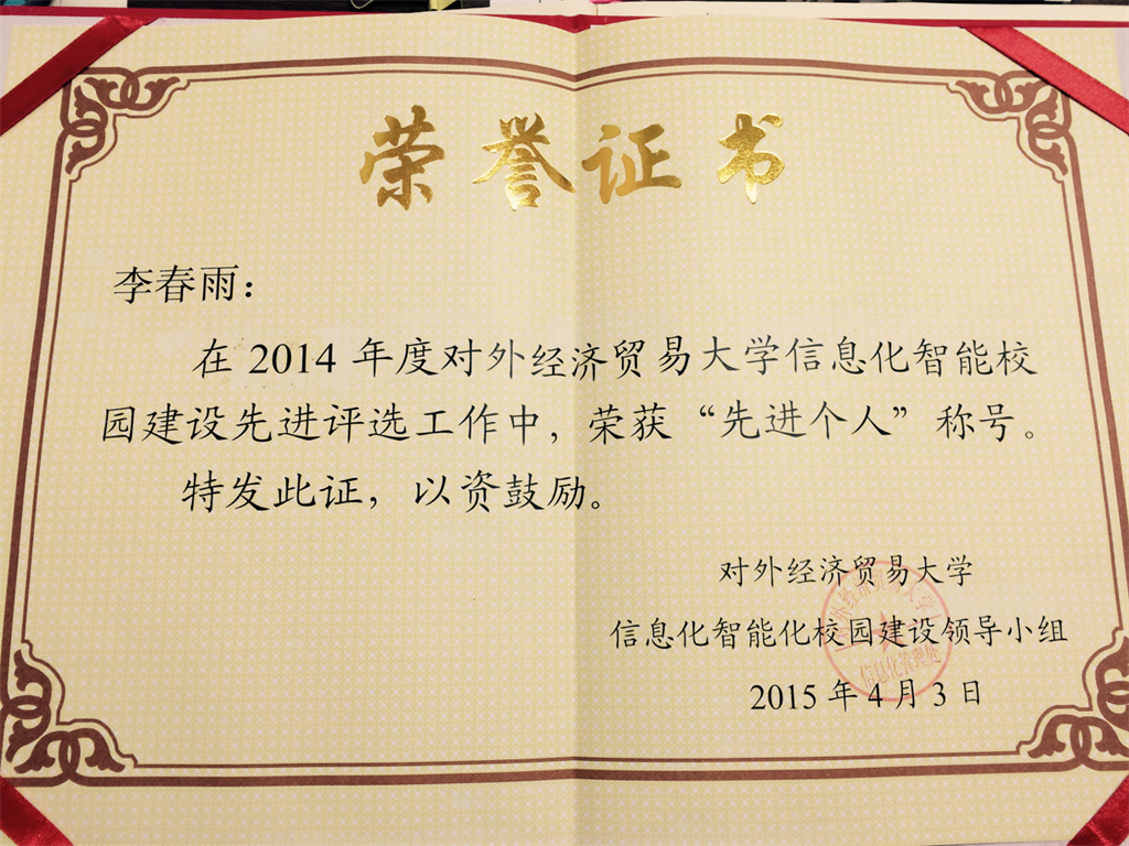 体育官网李春雨老师荣获2014年度对外经济贸易大学信息化智能校园建设先进个人称号