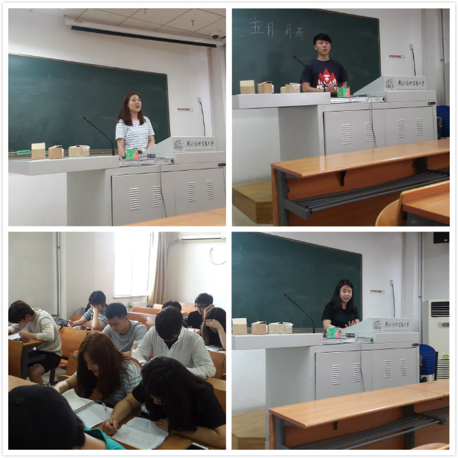 学院的月考类型分为两种,一种形式为主题演讲,一种形式是书面笔试。主题演讲时,负责老师提前给出话题供学生思考,学生需要用到课堂所学知识点,并结合时政新闻、个人生活经历等撰写演讲内容,然后在讲台上进行演讲。书面笔试时,老师会为学生精选前段时间学到的重要词汇供学生复习,然后通过笔试进行考核。