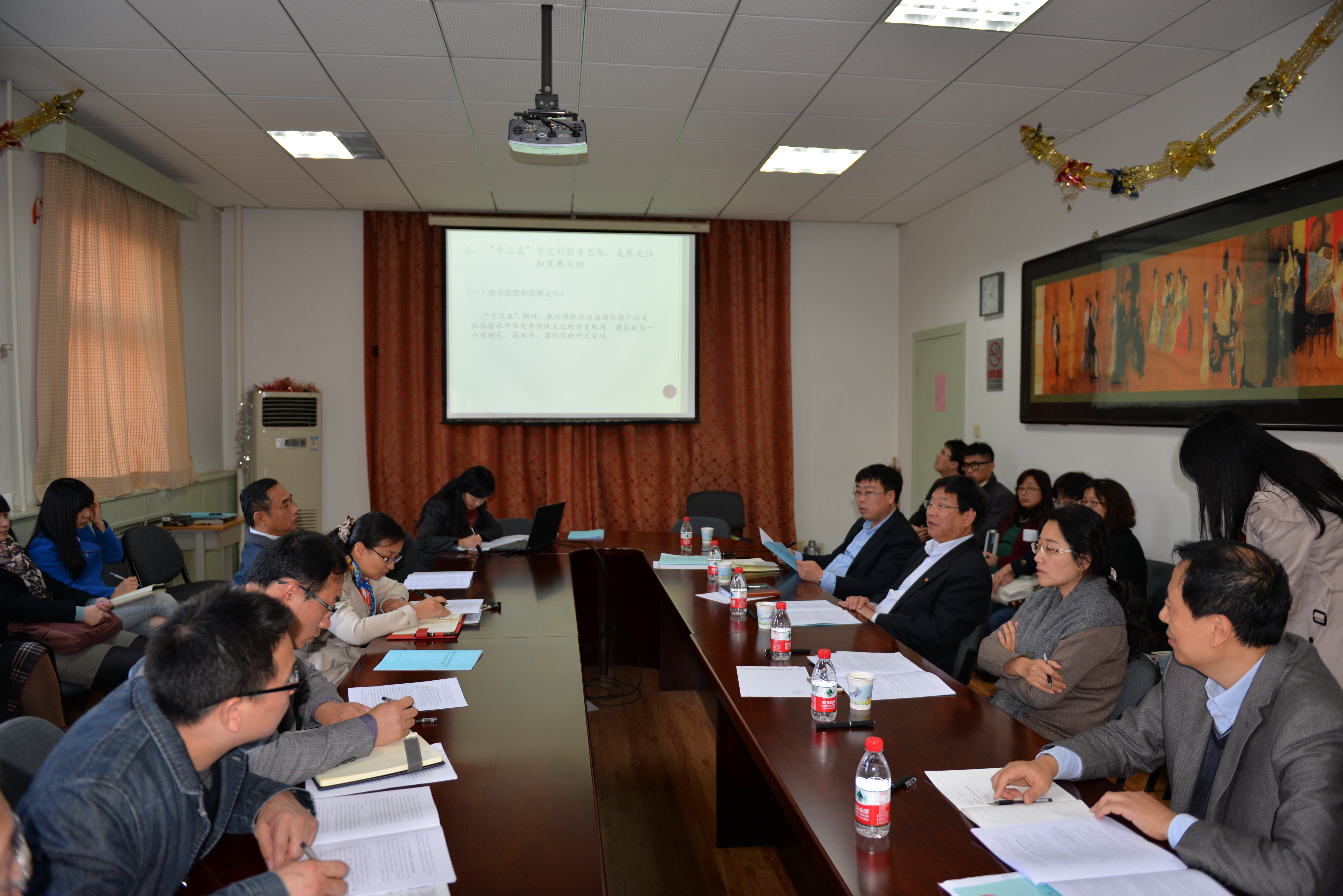 中文学院院长邓如冰教授回顾了中文学院“十二五”期间取得的成果和办学经验,并从学科建设、办学特色、资源整合、协同创新等方向汇报了学院“十三五”期间的发展规划。