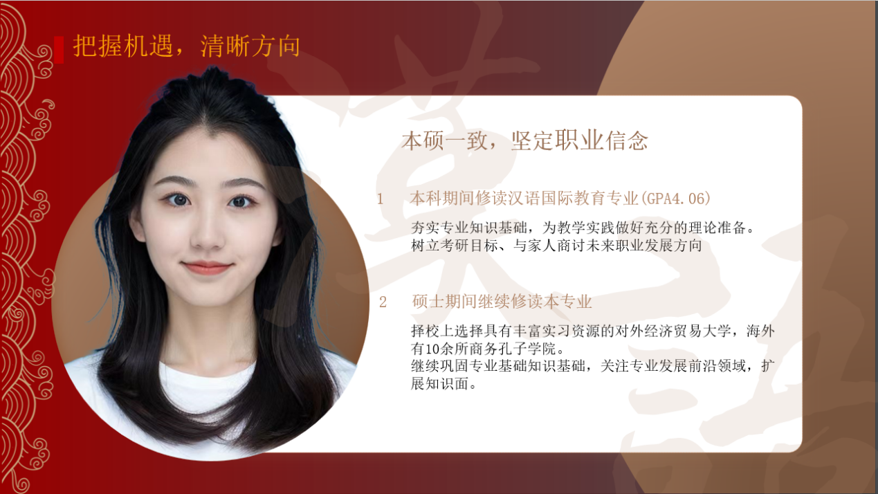 王馨雨以“以中文为媒,传中华之美”为主题,围绕“世界需要中文”、“我能教好中文”为主脉络,通过详尽的背景调查,对职业发展前景进行充分分析,并结合本科和硕士期间的竞赛、实习、学生工作等经历,对岗位匹配度进行分析,明晰职业发展路径,同时也主动预判风险因素,制定职业备选方案,对国际中文教师的成长发展路径进行了详细规划。