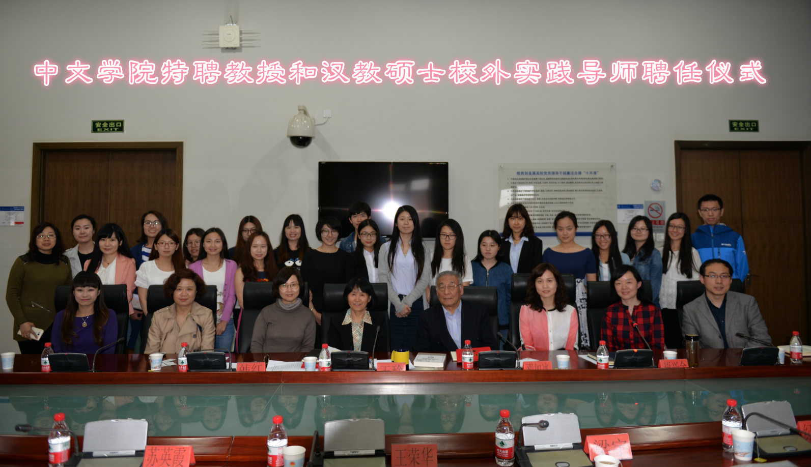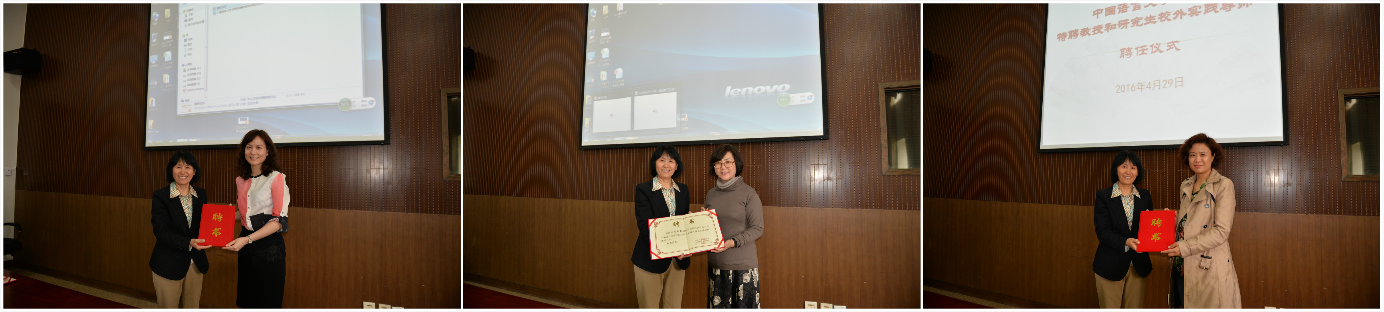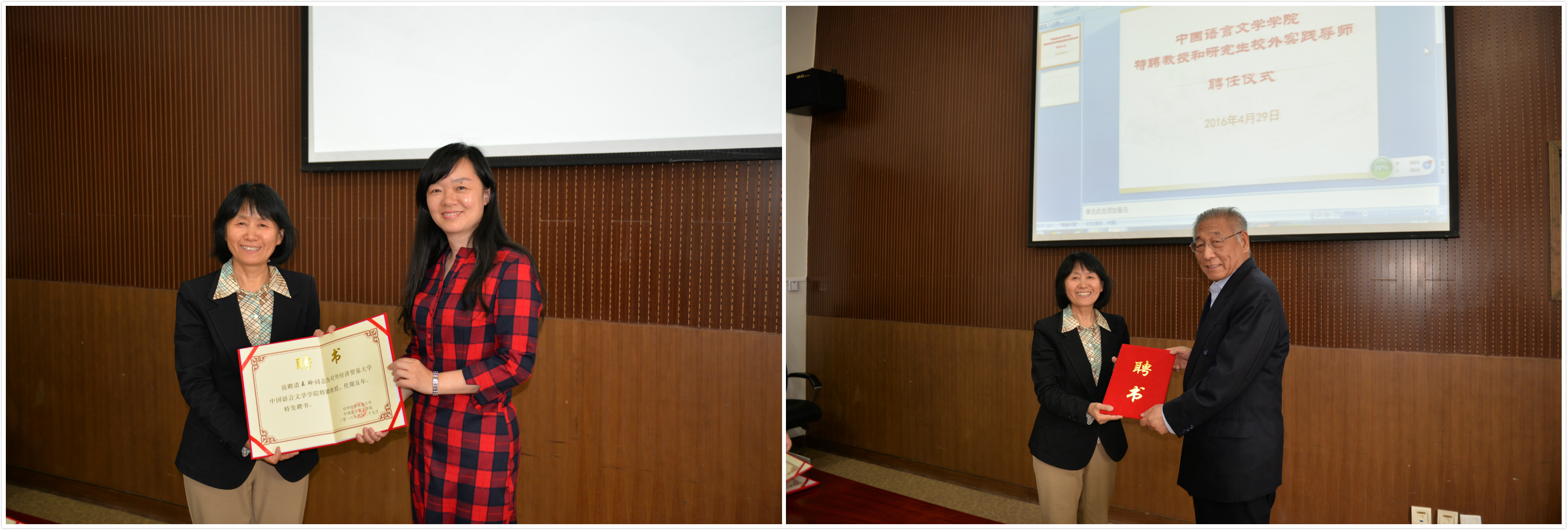 聘任仪式上,邓如冰院长代表中文学院为王玲书记颁发了特聘教授聘书,王书记为王荣华大使和各位实践导师代表颁发了特聘教授和实践导师聘书。王荣华大使表示:汉语国际教育事业是国家的重要战略,很高兴看到贸大为汉语国际教育事业添砖加瓦,祝愿贸大汉硕专业不断取得丰硕成果。高等教育出版社汉语分社长梁宇、北京语言大学教授苏英霞、中央电视台电影频道高级编辑林丽宁等专家学者纷纷表示很荣幸受聘为贸大的汉硕实践导师,并表示:我校的汉语国际教育专业是业界的后起之秀,标志着贸大的国际化工作再创佳绩,一定尽己所能,为贸大的汉硕培养贡献力量。韩红主任表示,商务汉语基地管理的10个孔子学院给汉语国际教育硕士提供了很好的实践平台,在校领导的指导下,我校汉语国际教育硕士培养事业一定会取得更大发展。