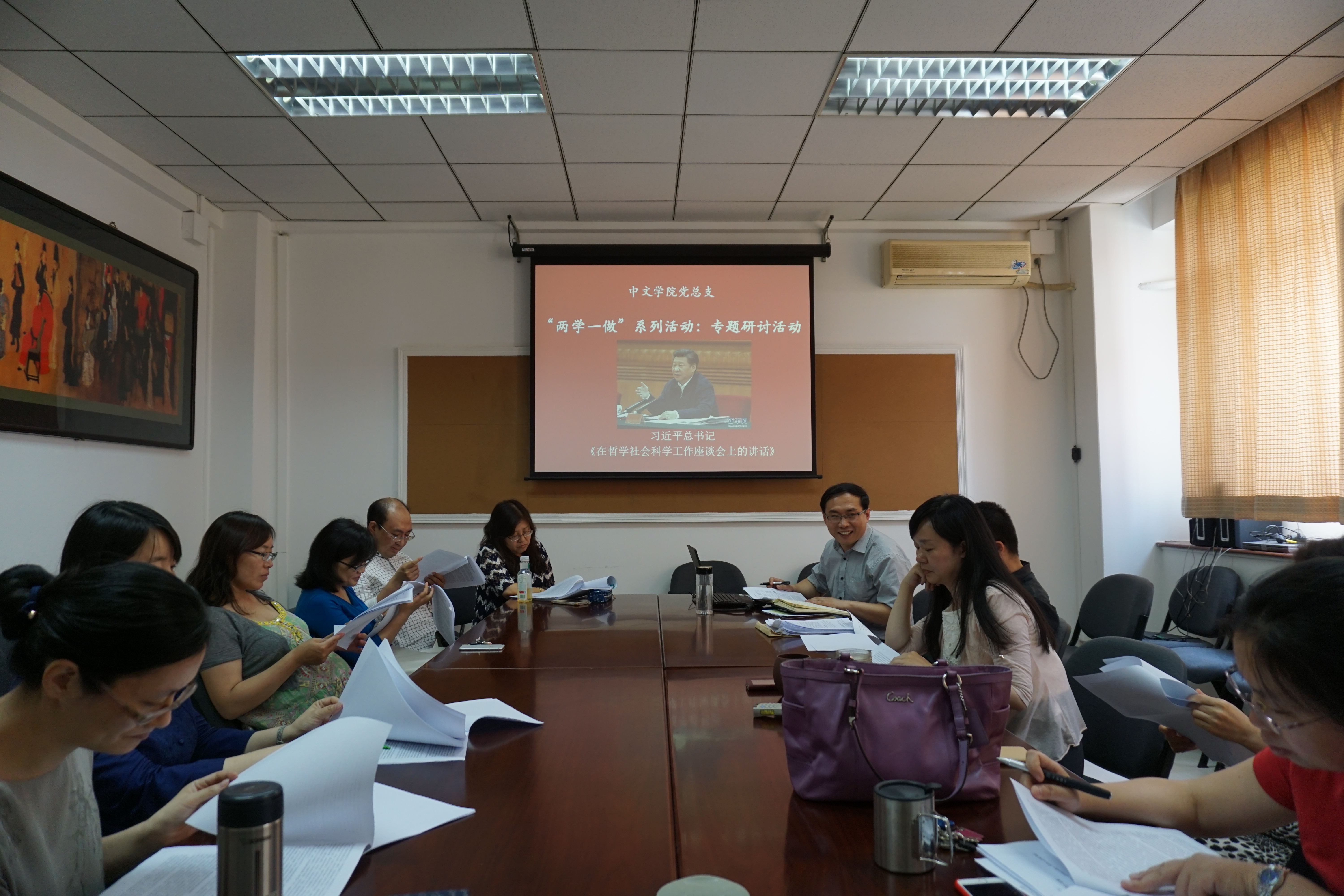 “两学一做”系列活动在中文学院持续开展。2016年6月16日下午2点,beat365体育官网平台党总支组织全体教师党员,在诚信楼422会议室学习习近平总书记在哲学社会科学工作座谈会上的讲话,并就讲话精神进行了专题讨论。