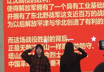 星星之火,可以燎原——塔山阻击战:第七组上场的是87星星之火队。战士的血泪挥洒在战场上,红旗也终于飘扬在祖国大地上。张亦航、安寒梅、苏星元三位同学用情景剧形式来呈现塔山阻击战:当代大学生走入战争体验馆,用VR技术体验辽沈战役中的塔山狙击战,亲历塔山狙击战中的英雄事迹。最后,87星星之火队以小见大,从塔山狙击战引出辽沈战役的介绍和意义。