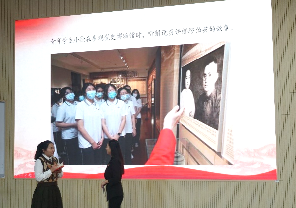 “以身许党”缪伯英——中国共产党第一位女党员:第一组展示的队伍是“社会主义接班人”。中国共产党第一位女党员——缪伯英,她用生命书写壮丽春秋,志在以身许党,恨未战死沙场。常玲丽、刘珍、徐梦瑜三位同学演绎青年学生参观纪念馆、穿越时空与缪伯英对话的场景,带领大家回顾了女英雄缪伯英在李大钊的感召下入党、参加京汉铁路北段总罢工等事迹。