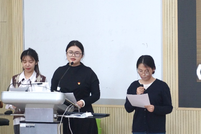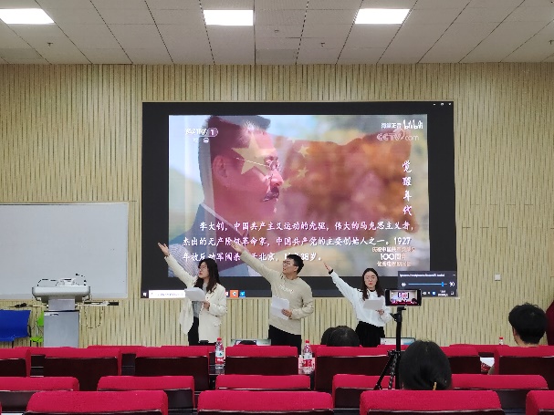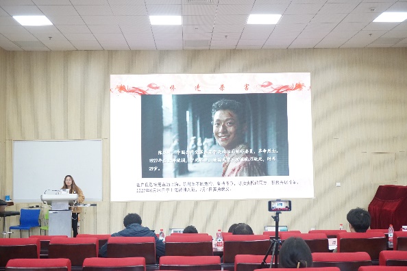 传承红色基因,致敬革命先烈——以李大钊同志为例:最后一组上场的是“学习新思想,争做新青年”小组。王柳婧、尹沂蒙、孙宜萌三位同学运用PPT和教学视频向大家介绍了革命先烈李大钊同志的生平、主要贡献、思想成果及外界对他的评价。