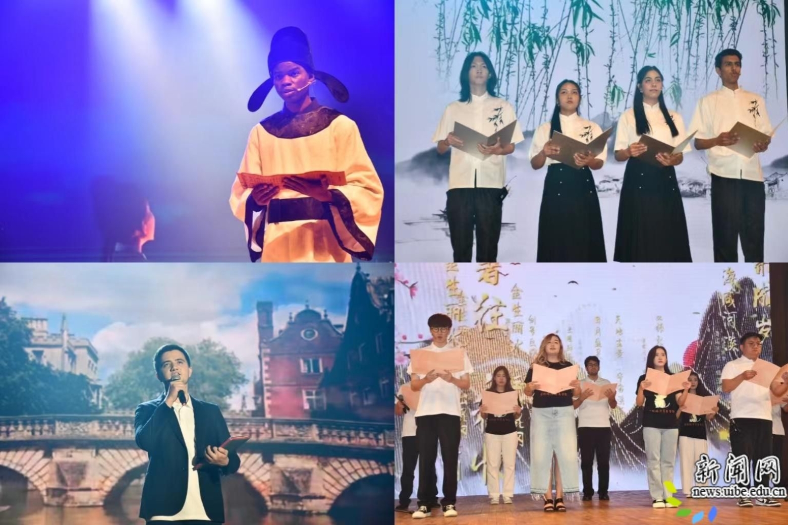 中华优秀传统文化也深深的吸引了国际留学生,他们在这次比赛中带来精彩纷呈的节目。来自乌兹别克斯坦的同学为观众带来了《再别康桥》,他的朗诵,不仅让观众感受到了《再别康桥》的美,更看到了他作为一个留学生,对中文诗歌的热爱和追求。国际学院的留学生以一首《短歌行》致敬传统文化,带领大家静下心来品味这些古典文学的魅力。在《诗魂筑风骨》这一作品中,国际经济贸易学院的留学生们用他们独特的视角和方式,为我们展现中华诗词的深厚内涵和独特魅力。在《将进酒》朗诵中,国际学院的同学用慷慨激昂的语调表达出李白的失望与自信、悲愤与抗争的复杂情绪。来自伊朗的爱琳同学,选择《岳阳楼记》这一经典作品,带领大家感受洞庭湖的风光。