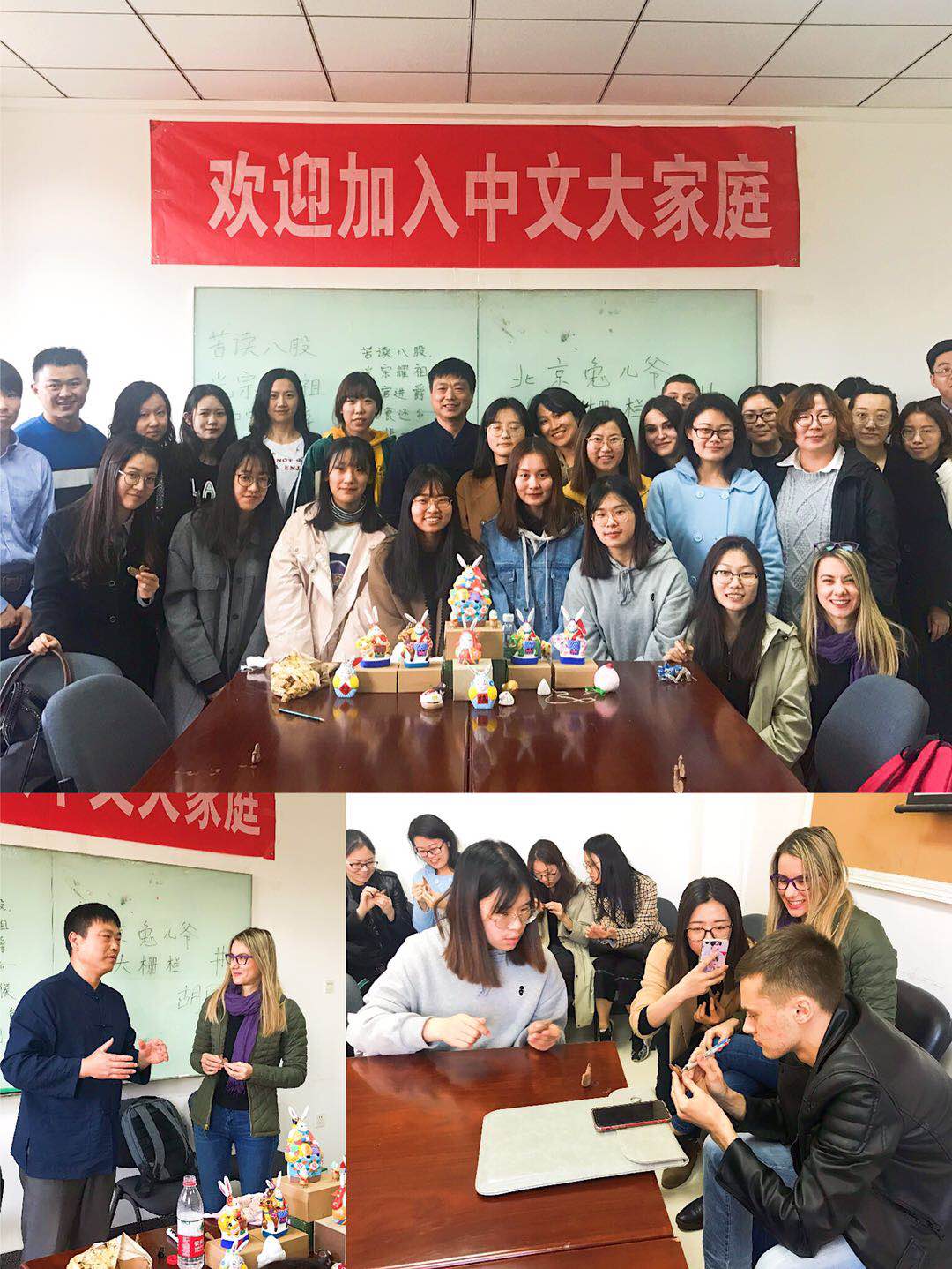 泥彩塑是中国一门古老的艺术,在北京土生土长的张忠强老师是目前为数不多还在制作北京兔儿爷的老手艺人之一。他现场展示了泥塑的制作,以中国传统泥塑和老玩具为载体,用生动幽默的语言为大家介绍了北京兔儿爷的历史、中秋节传统习俗以及相关的神话传说。在泥塑表达的传统文化中,做人应有“五德”:文、武、仁、勇、信,希望同学们把这些为人处世之道继承下去。最后,张忠强老师教大家动手制作泥塑,中外同学们纷纷动手学习,一个个形态各异的小泥塑相继诞生。张老师针对在场的留学生,对不同国家对不同动物的崇拜,一一捏出公鸡、野猪等造型小巧的泥塑,当场赠送给他们,深受同学们欢迎。