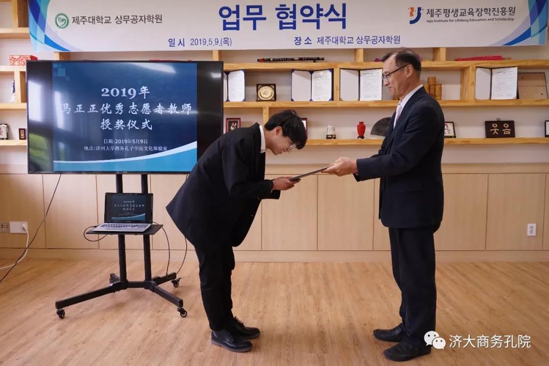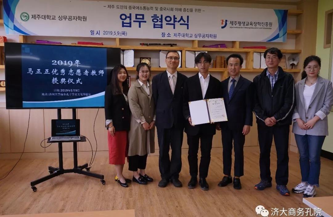 进一步推进孔子学院在汉语国际传播方面的影响力,同时也为鼓励更多的优秀志愿者教师赴海外进行汉语教学,济州大学商务孔子学院于5月9日为马正正老师颁发优秀志愿者教师荣誉证书。