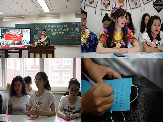 班会以“团结一心担当使命,砥砺奋进励志报国”为主题,各民族学子就深入学习习近平总书记在纪念五四运动100周年大会上重要讲话,在班会中分享了心得体会。来自新疆达斡尔族的班长郭世龙介绍了1919年五四运动的背景和经过,把同学们带回那被欺辱被压迫的黑暗历史中。他谈到,在民族危难之际,五四运动如同惊雷闪电,劈开了旧中国如磐的黑暗,以磅礴之力鼓动了中国人民和中华民族实现民族复兴的志向和信心。