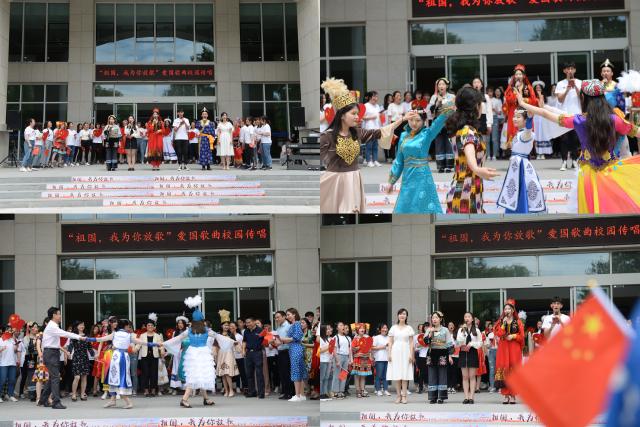 随着《我和我的祖国》的乐声奏响,同学们手持五星红旗,随着乐声轻轻摇摆,在求索楼门前汇聚成一条红色的小河。各民族学生身着明艳的民族服饰,和着音乐的节拍跳起舞蹈。民族服饰缤纷的色彩汇入五星红旗摇动的红色河流中,映衬着学生们灿烂的笑容,交织成一道独具青春色彩的亮丽风景。师生演唱《打起手鼓唱起歌》和《歌唱祖国》,欢快的歌声感染了在场师生,歌声传递出拳拳真切的爱国之情,彰显民族融合的团结之心,在激情澎湃的放声高歌中,每个人脸上都洋溢着欢乐的笑容,为祖国的繁荣昌盛感到由衷自豪。